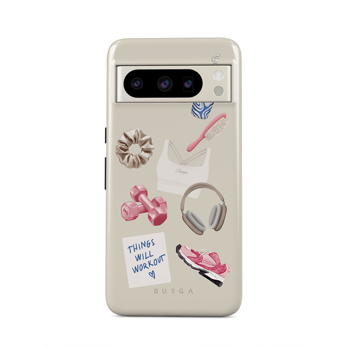 Dieses Design enthält: Hanteln, Kopfhörer, Trinkflasche, Haarbürste, pinke Sneaker, Sport-BH, Crunchie-Riegel, „Things Will Work Out“-Haftnotiz.