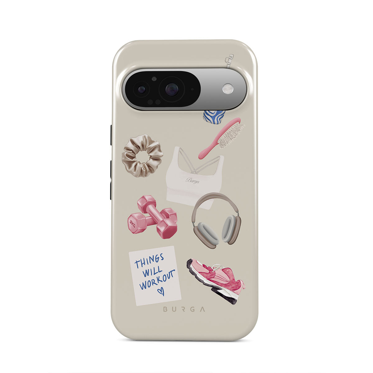 Dieses Design enthält: Hanteln, Kopfhörer, Trinkflasche, Haarbürste, pinke Sneaker, Sport-BH, Crunchie-Riegel, „Things Will Work Out“-Haftnotiz.