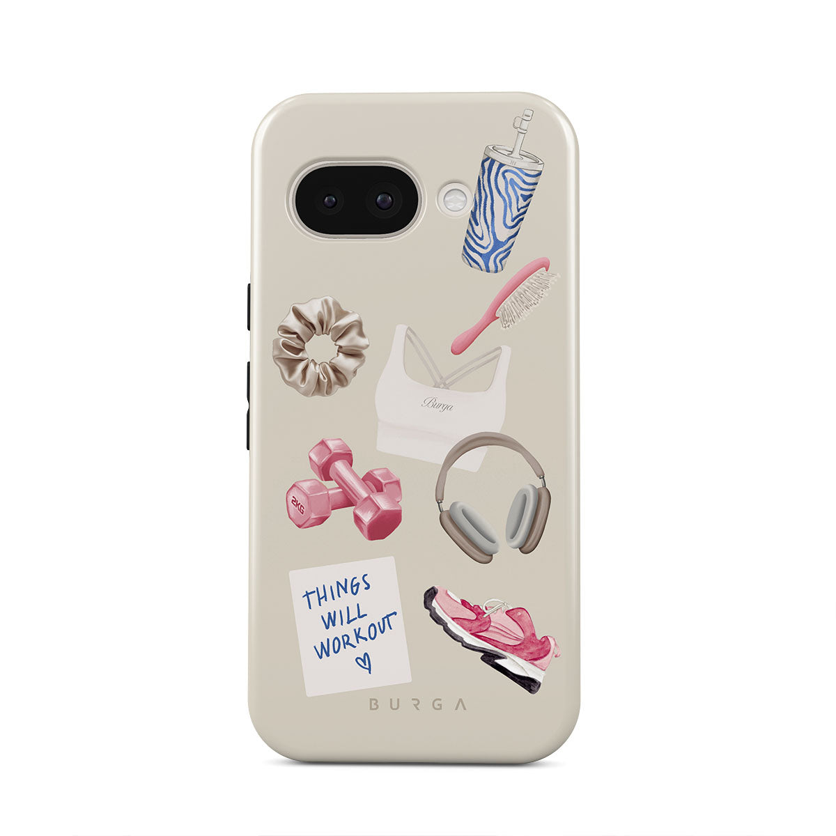 Dieses Design enthält: Hanteln, Kopfhörer, Trinkflasche, Haarbürste, pinke Sneaker, Sport-BH, Crunchie-Riegel, „Things Will Work Out“-Haftnotiz.