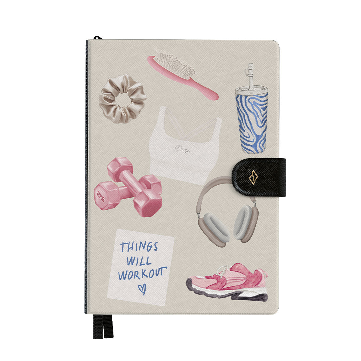 Dieses Design enthält: Hanteln, Kopfhörer, Trinkflasche, Haarbürste, pinke Sneaker, Sport-BH, Crunchie-Riegel, „Things Will Work Out“-Haftnotiz.