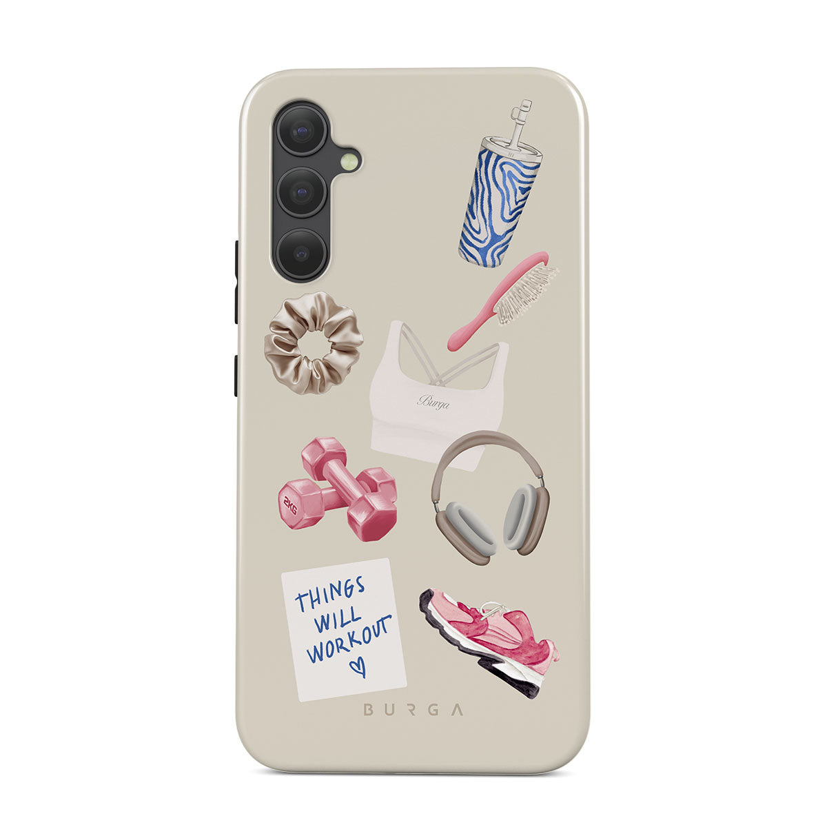 Dieses Design enthält: Hanteln, Kopfhörer, Trinkflasche, Haarbürste, pinke Sneaker, Sport-BH, Crunchie-Riegel, „Things Will Work Out“-Haftnotiz.