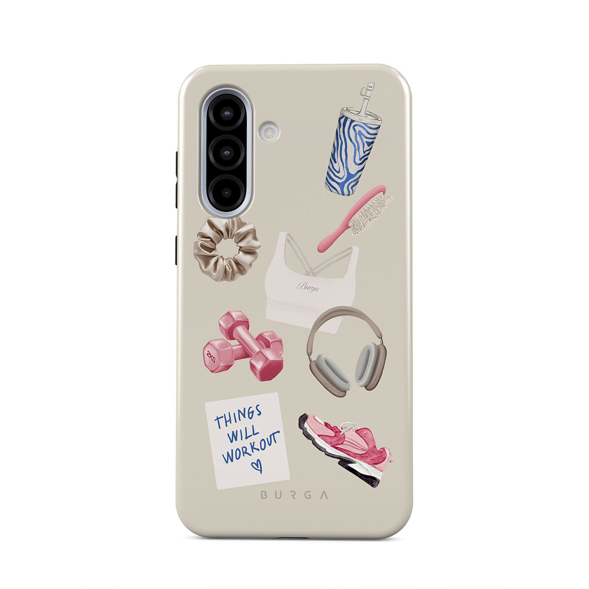 Dieses Design enthält: Hanteln, Kopfhörer, Trinkflasche, Haarbürste, pinke Sneaker, Sport-BH, Crunchie-Riegel, „Things Will Work Out“-Haftnotiz.