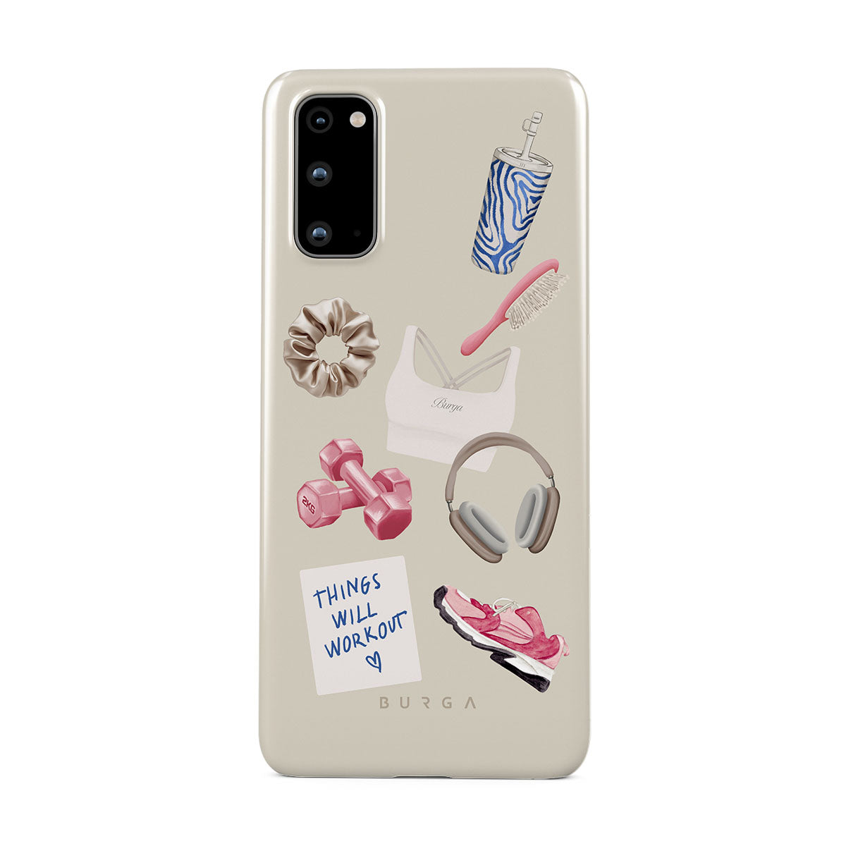 Dieses Design enthält: Hanteln, Kopfhörer, Trinkflasche, Haarbürste, pinke Sneaker, Sport-BH, Crunchie-Riegel, „Things Will Work Out“-Haftnotiz.