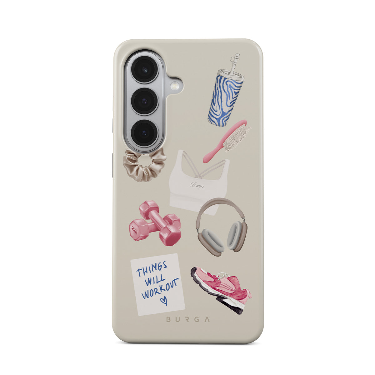 Dieses Design enthält: Hanteln, Kopfhörer, Trinkflasche, Haarbürste, pinke Sneaker, Sport-BH, Crunchie-Riegel, „Things Will Work Out“-Haftnotiz.