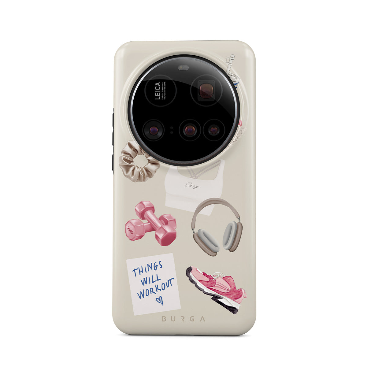 Dieses Design enthält: Hanteln, Kopfhörer, Trinkflasche, Haarbürste, pinke Sneaker, Sport-BH, Crunchie-Riegel, „Things Will Work Out“-Haftnotiz.