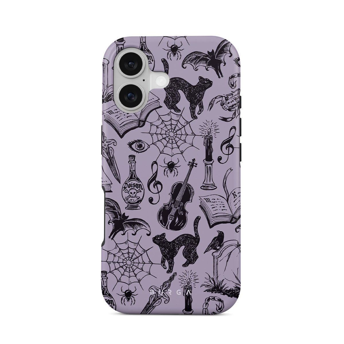 Dieses Design enthält: Gotische Kritzeleien, mystische Elemente, Spinnen, Spinnennetz, Katze, Violine, Auge, Kerze, Dolch, Buch, Fledermaus, Krähe, Skorpion