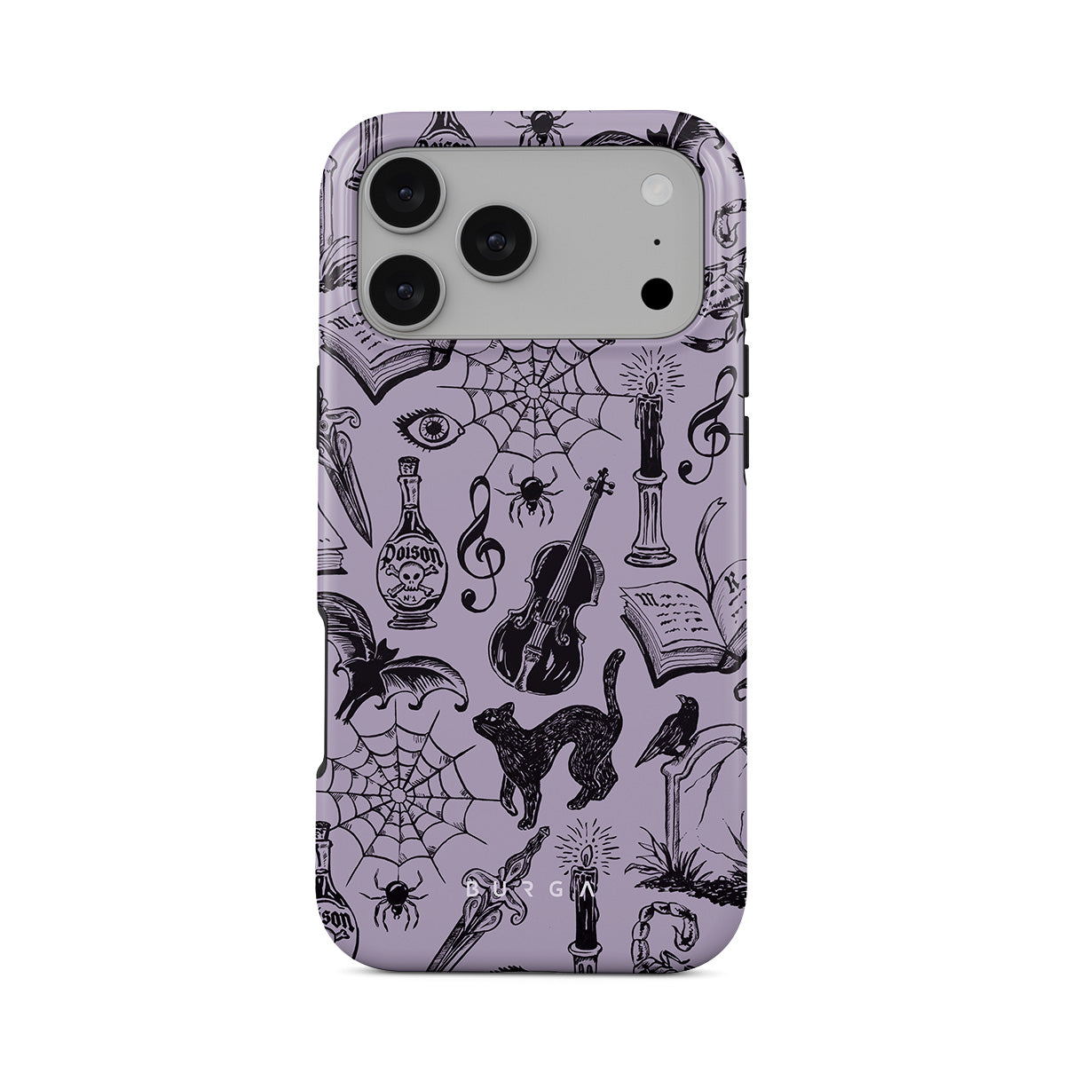Dieses Design enthält: Gotische Kritzeleien, mystische Elemente, Spinnen, Spinnennetz, Katze, Violine, Auge, Kerze, Dolch, Buch, Fledermaus, Krähe, Skorpion