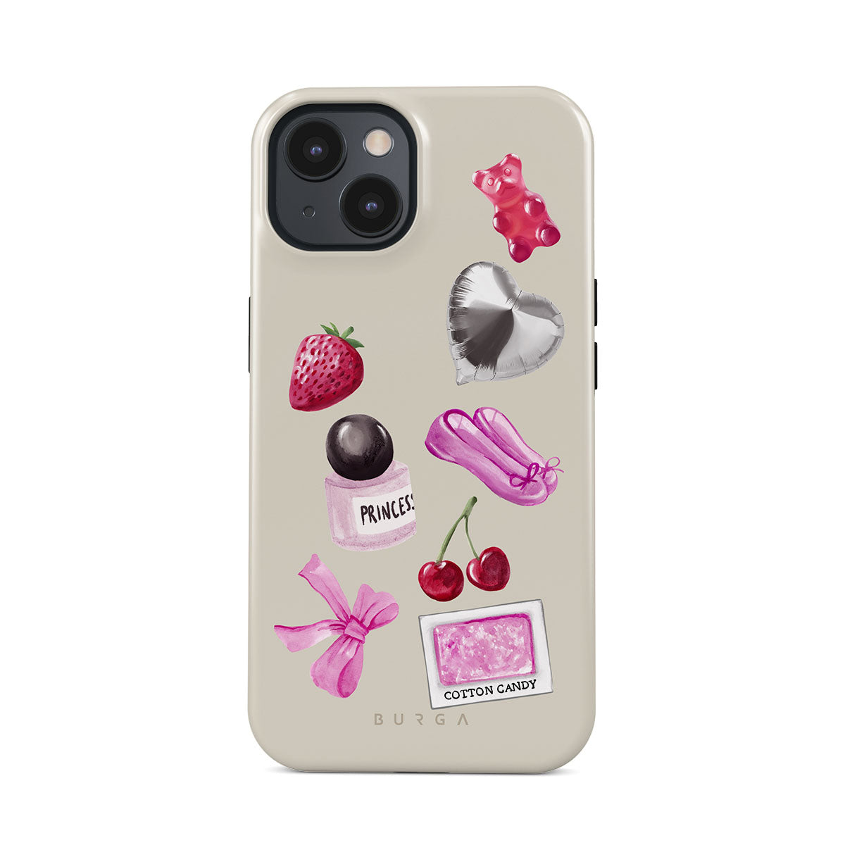 Dieses Design enthält: pinke Schleife, herzförmiger silberner Ballon, Parfümflasche, Erdbeere, Kirschen, pinke Ballettschuhe, Zuckerwatte-Sticker, pinker Gummibär.