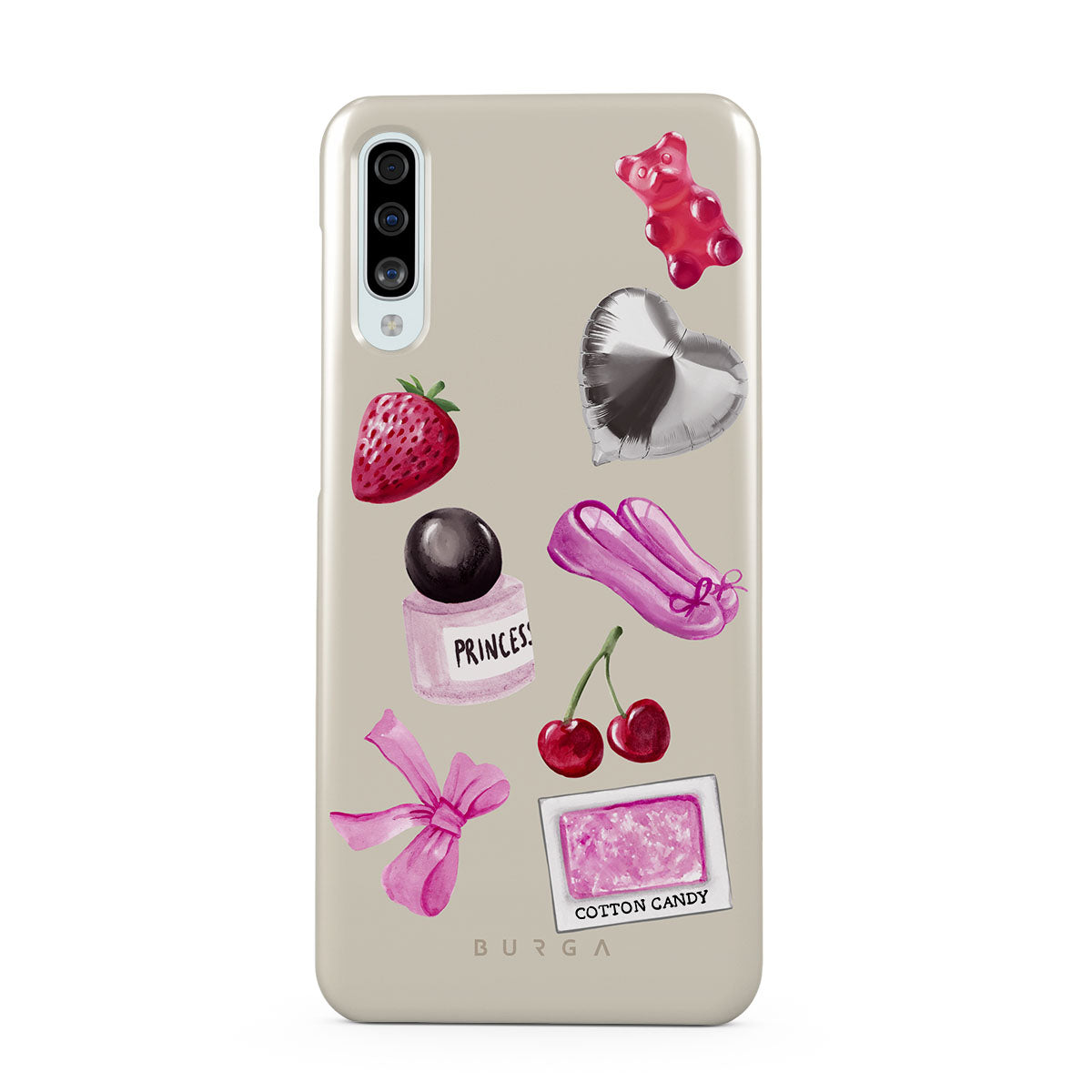 Dieses Design enthält: pinke Schleife, herzförmiger silberner Ballon, Parfümflasche, Erdbeere, Kirschen, pinke Ballettschuhe, Zuckerwatte-Sticker, pinker Gummibär.