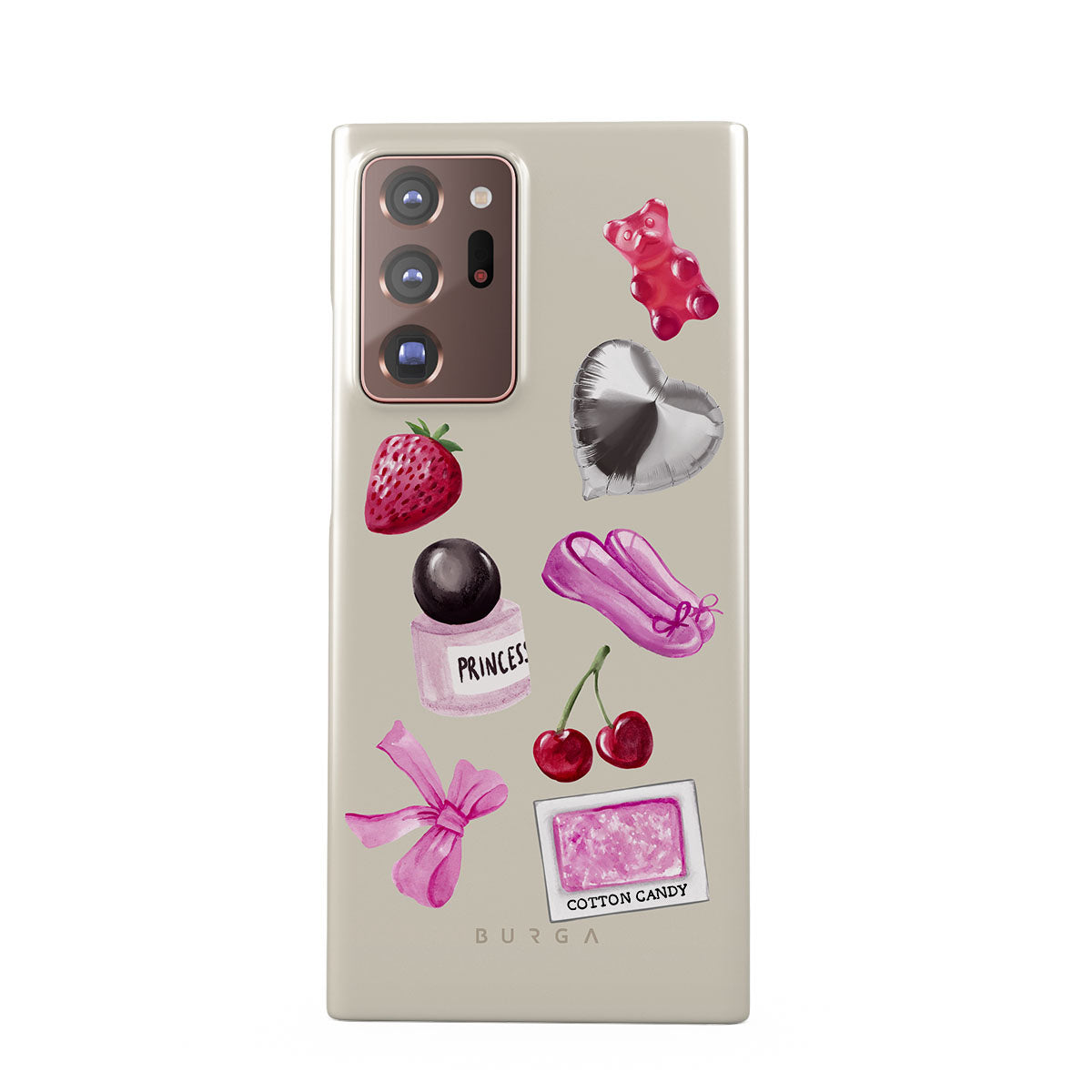 Dieses Design enthält: pinke Schleife, herzförmiger silberner Ballon, Parfümflasche, Erdbeere, Kirschen, pinke Ballettschuhe, Zuckerwatte-Sticker, pinker Gummibär.