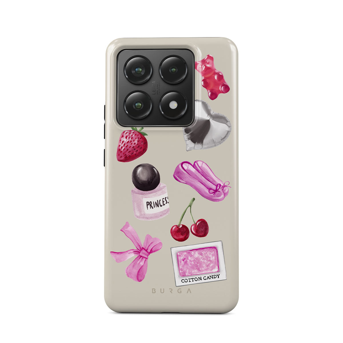 Dieses Design enthält: pinke Schleife, herzförmiger silberner Ballon, Parfümflasche, Erdbeere, Kirschen, pinke Ballettschuhe, Zuckerwatte-Sticker, pinker Gummibär.