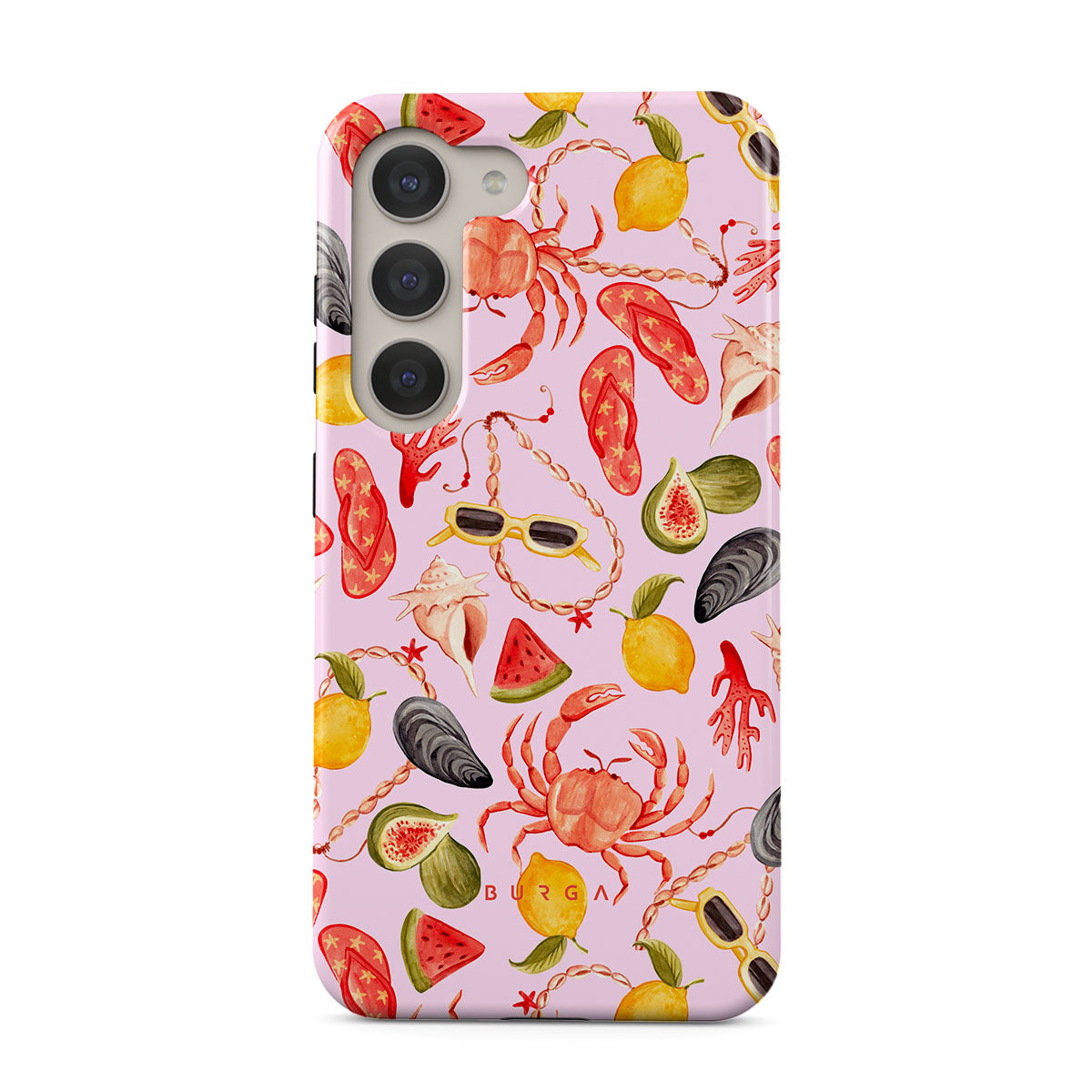 Dieses Design enthält: Wassermelone, Sonnenbrillen, Meeresfrüchte, Krabbe, Flip-Flops, Austern, Zitrone, lebendige Farben, tropisches Thema