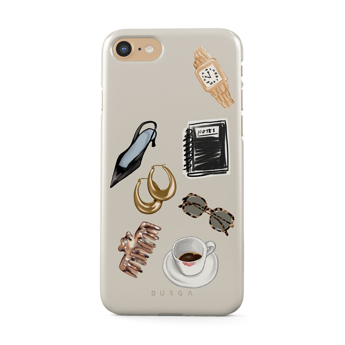 Dieses Design enthält: schwarzer High Heel, goldene Creolen, schwarzes Notizbuch, Kaffeebecher, Brille mit Schildpattmuster, braunes Haargummi, Retro-Golduhr.