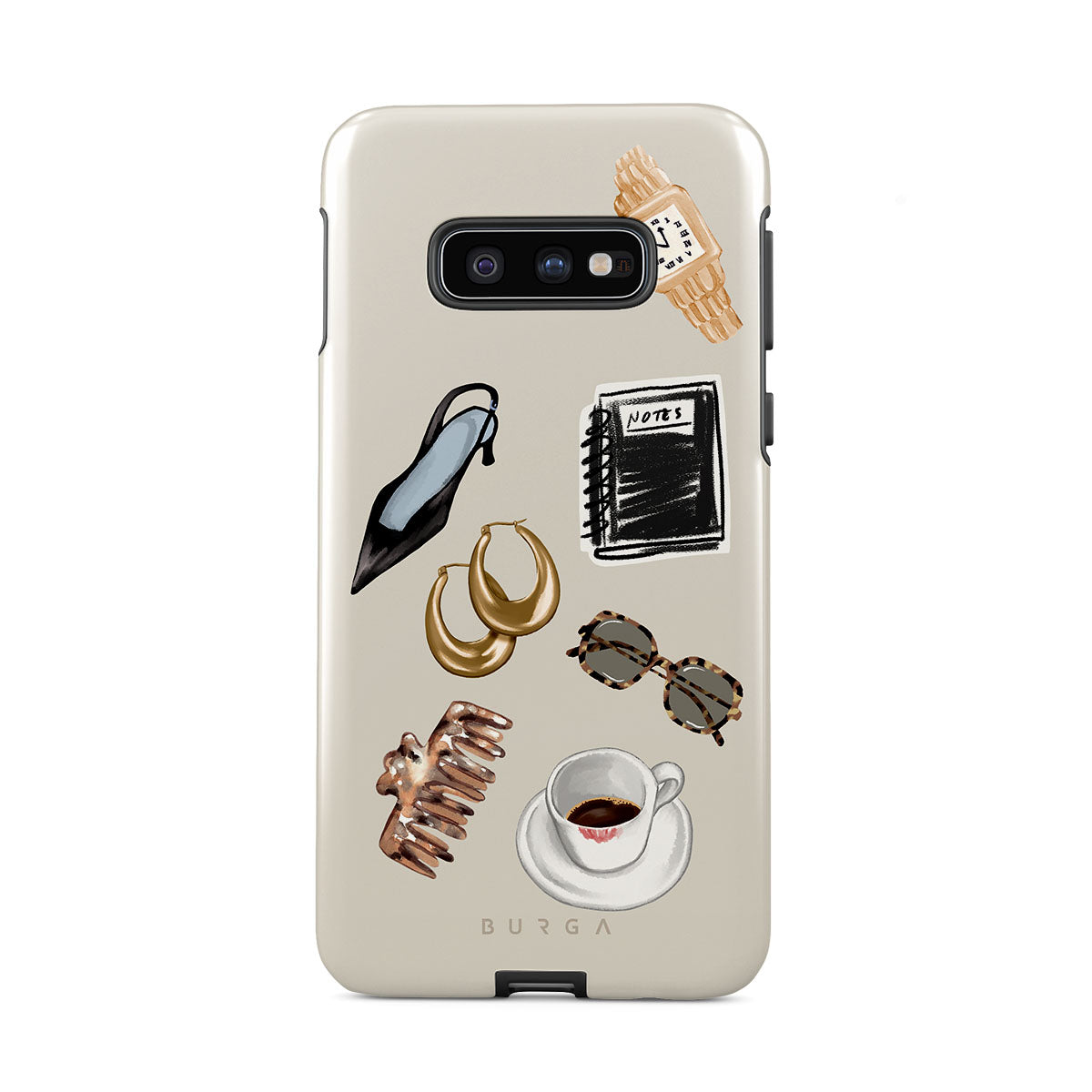 Dieses Design enthält: schwarzer High Heel, goldene Creolen, schwarzes Notizbuch, Kaffeebecher, Brille mit Schildpattmuster, braunes Haargummi, Retro-Golduhr.