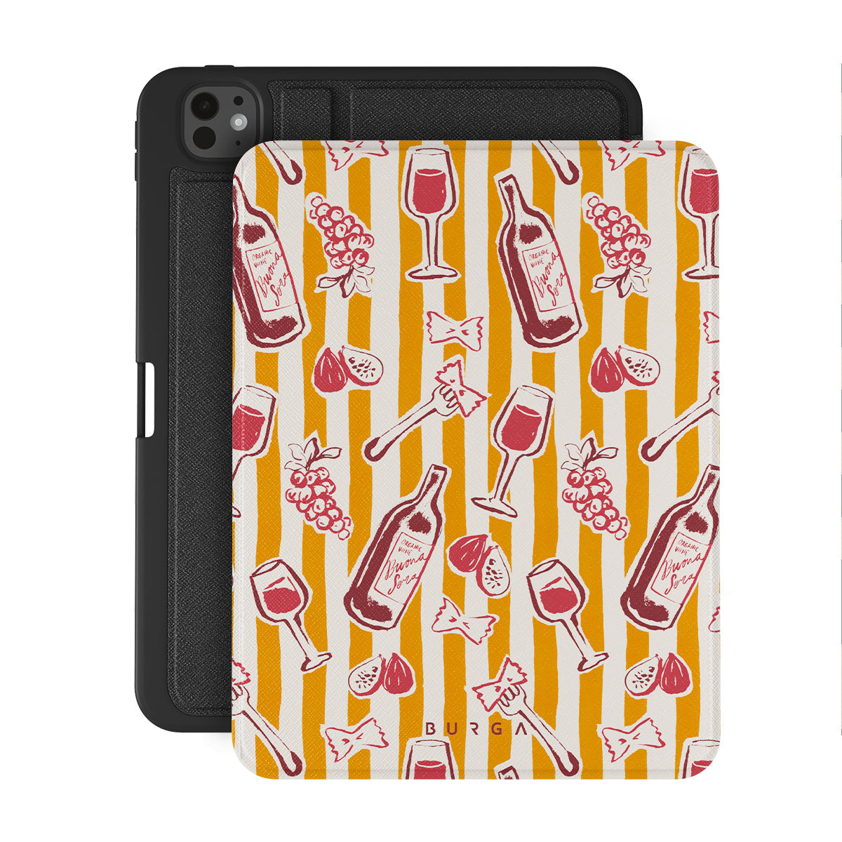 Dieses Design enthält: Obst, Feigen, Trauben, Gabeln, Pasta, Wein, Glas, Streifen.
