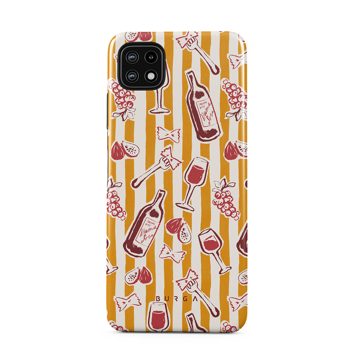 Dieses Design enthält: Obst, Feigen, Trauben, Gabeln, Pasta, Wein, Glas, Streifen.