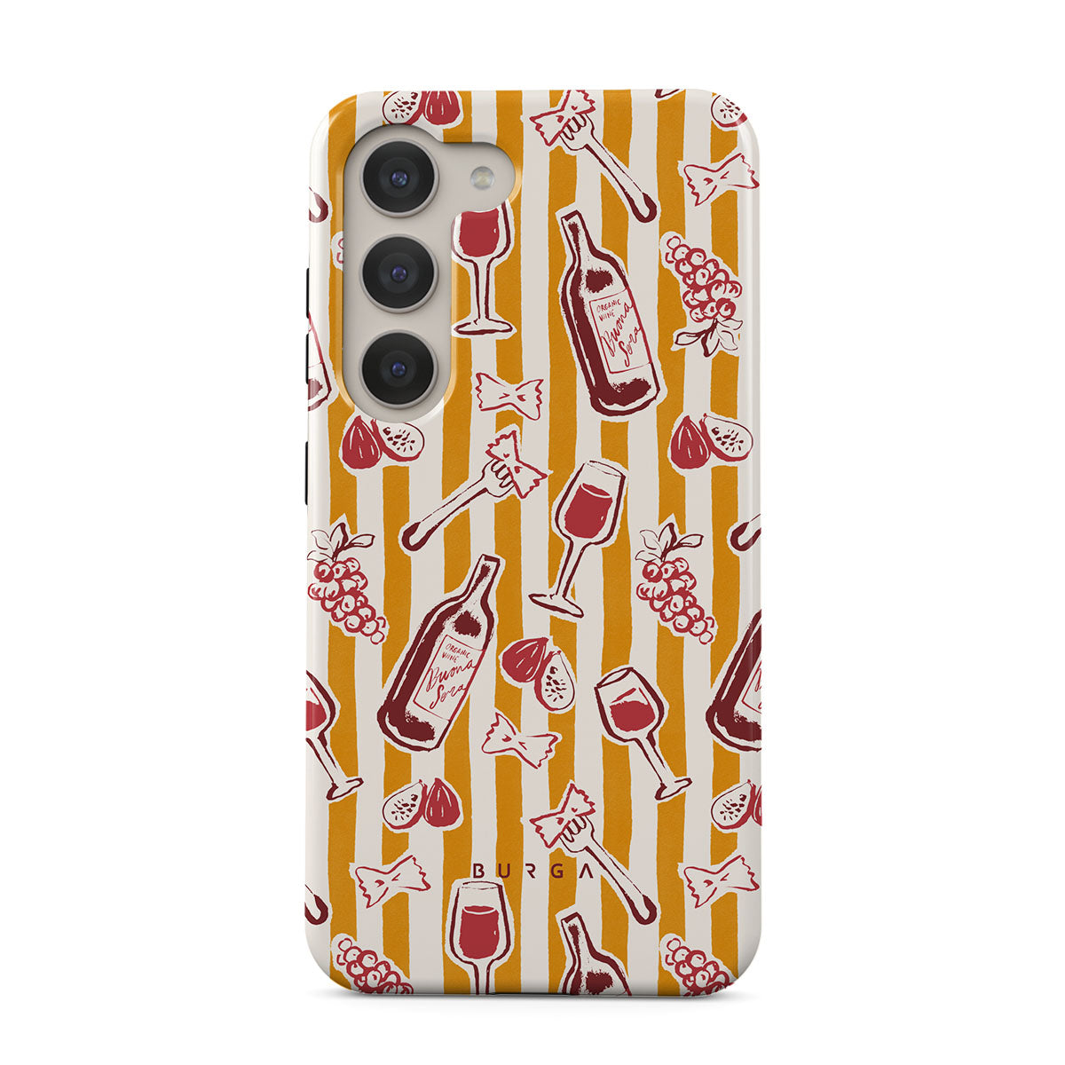 Dieses Design enthält: Obst, Feigen, Trauben, Gabeln, Pasta, Wein, Glas, Streifen.