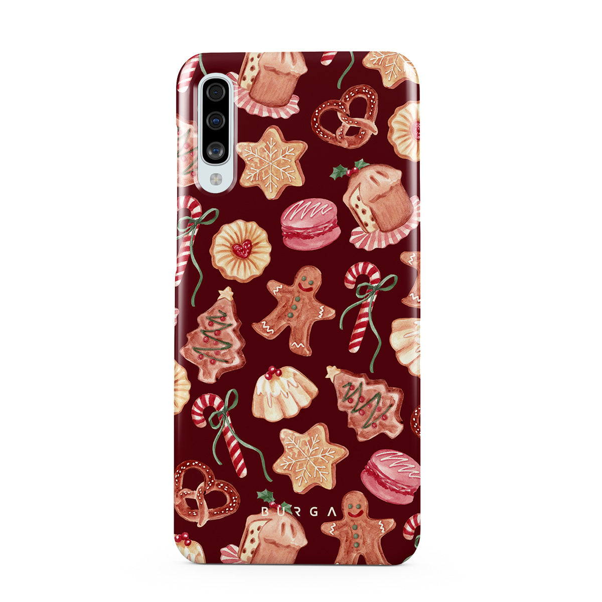 Dieses Design enthält: Weihnachtskekse, Lebkuchenmänner, Zuckerstangen, Pfefferminzbonbons, festliche Süßigkeiten, burgunderroter Hintergrund