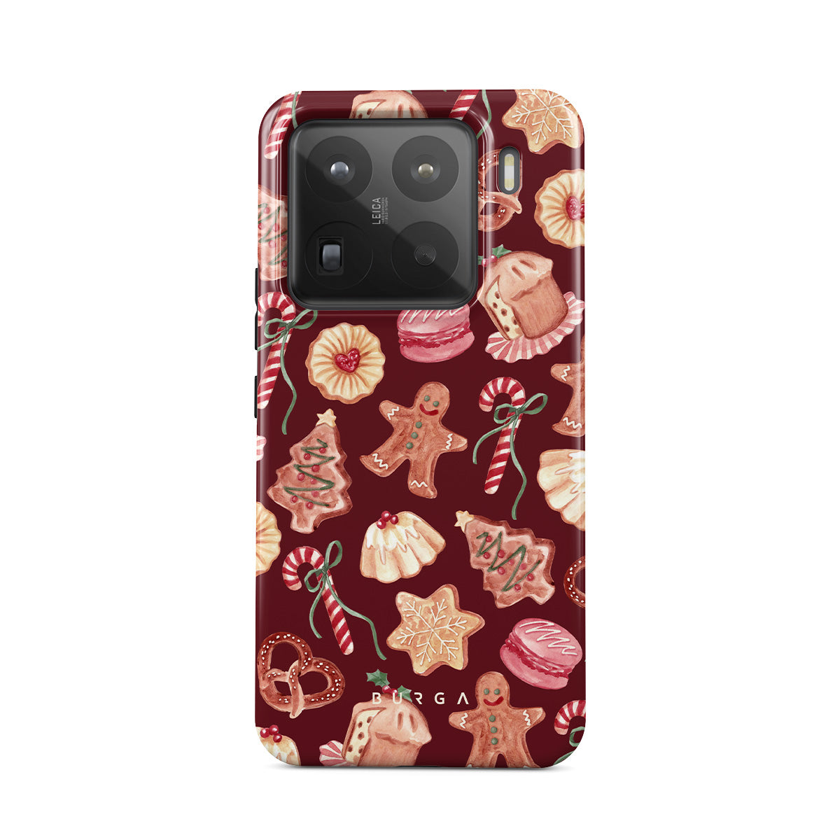 Dieses Design enthält: Weihnachtskekse, Lebkuchenmänner, Zuckerstangen, Pfefferminzbonbons, festliche Süßigkeiten, burgunderroter Hintergrund