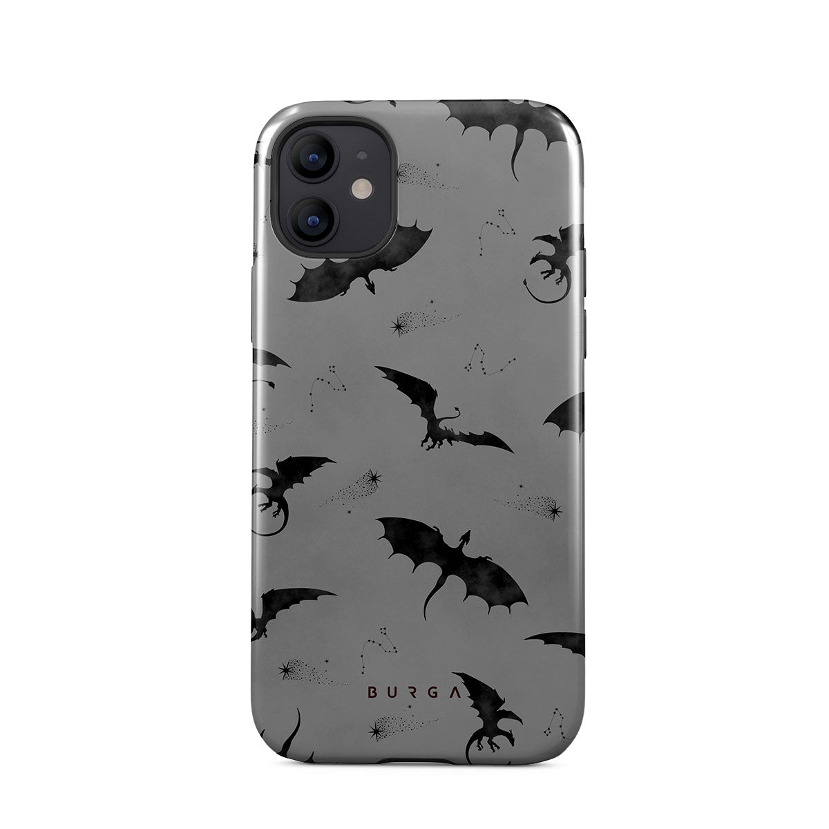 Dieses Design zeigt: Fledermäuse, Drachen, grauer Himmel, Nachthimmel, Schattenkreaturen.