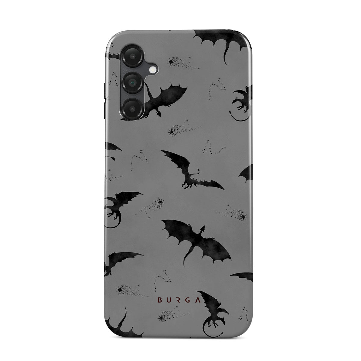 Dieses Design zeigt: Fledermäuse, Drachen, grauer Himmel, Nachthimmel, Schattenkreaturen.