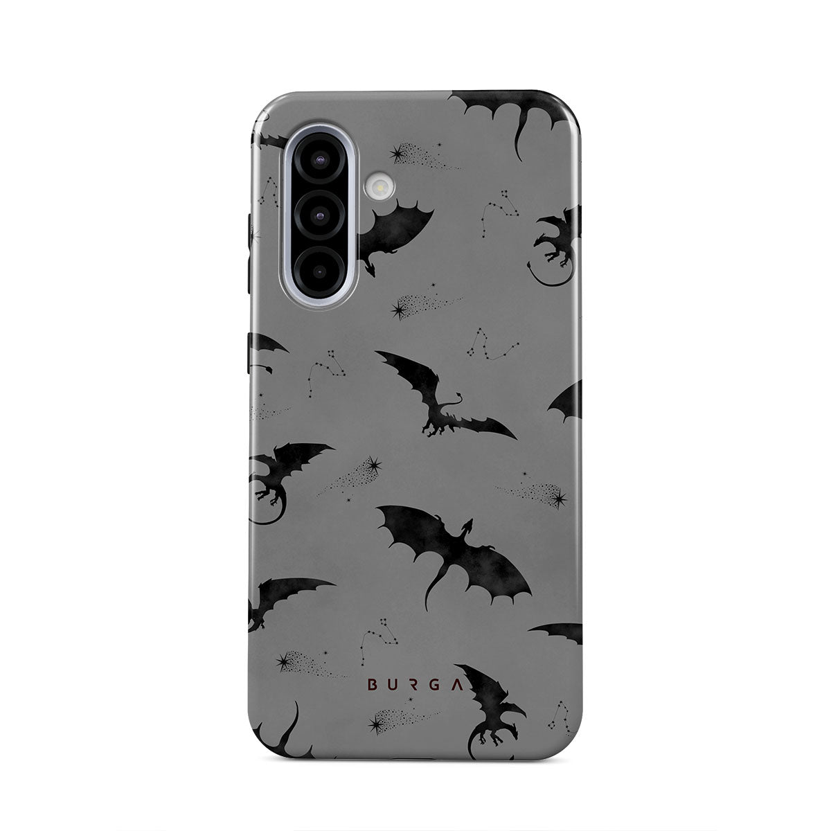 Dieses Design zeigt: Fledermäuse, Drachen, grauer Himmel, Nachthimmel, Schattenkreaturen.