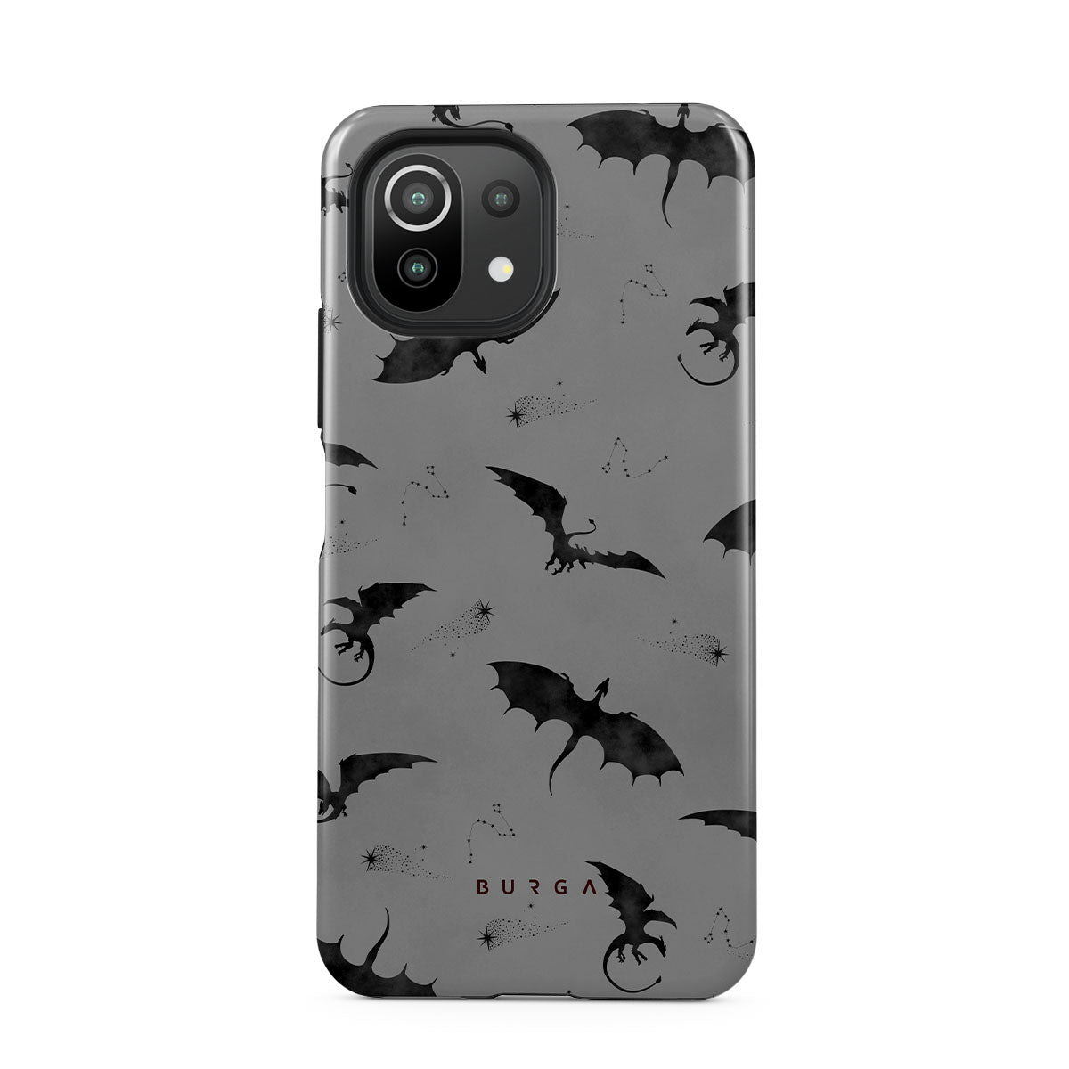 Dieses Design zeigt: Fledermäuse, Drachen, grauer Himmel, Nachthimmel, Schattenkreaturen.