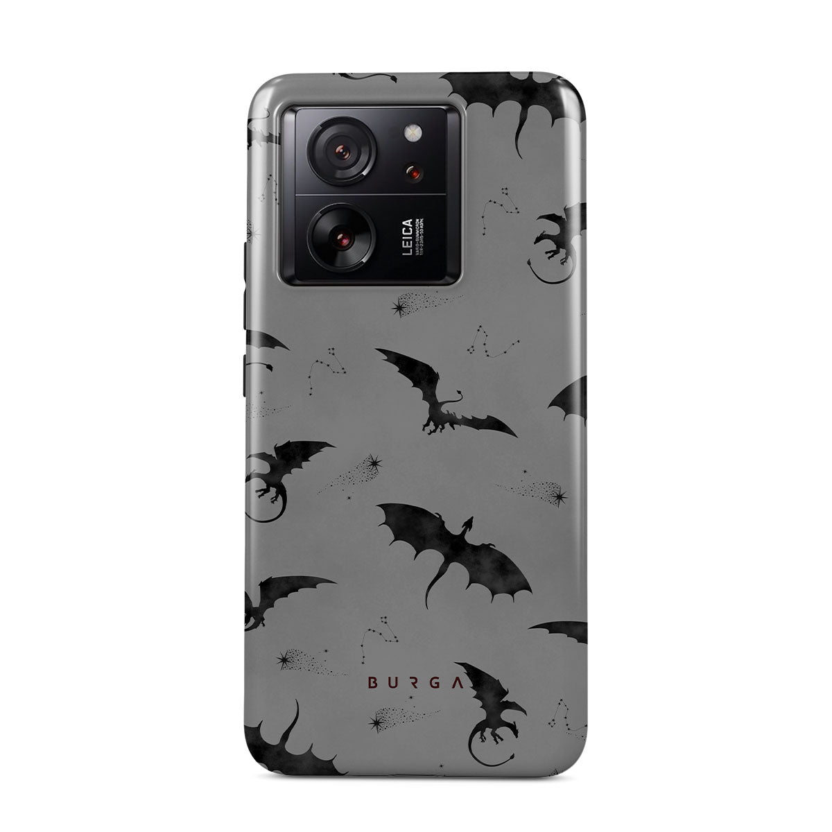 Dieses Design zeigt: Fledermäuse, Drachen, grauer Himmel, Nachthimmel, Schattenkreaturen.