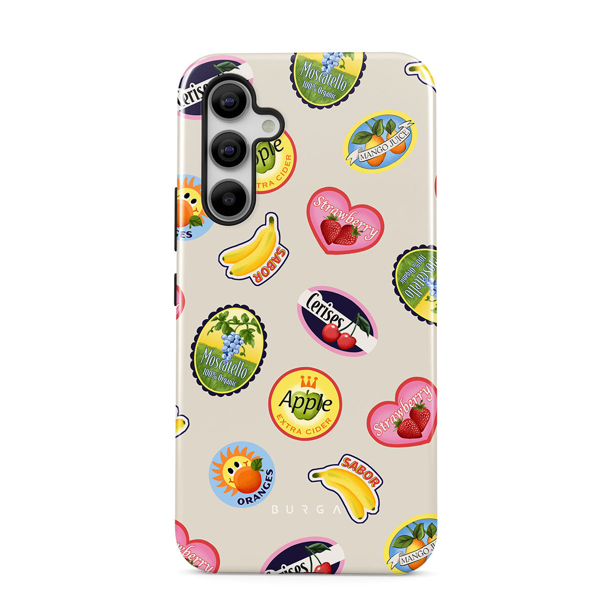 Dieses Design enthält: Bananen, Briefmarken, Kirschen, Äpfel, Orangen, Erdbeeren, leuchtende Farben, Zitrusakzente, Fruchtmotive, tropische Muster.