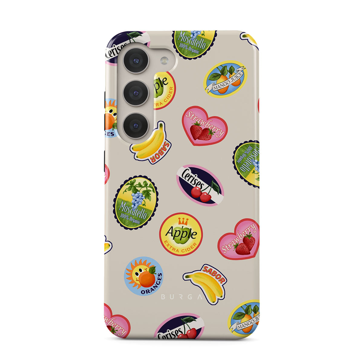 Dieses Design enthält: Bananen, Briefmarken, Kirschen, Äpfel, Orangen, Erdbeeren, leuchtende Farben, Zitrusakzente, Fruchtmotive, tropische Muster.