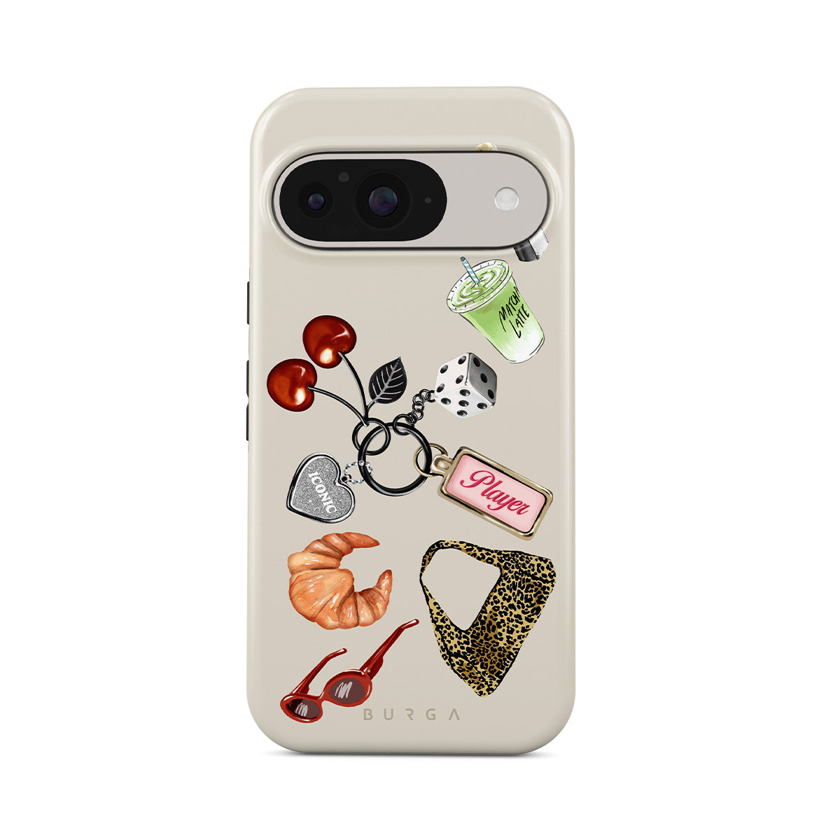 Dieses Design enthält: rote Sonnenbrille, roter Lippenstift, grünes Matcha-Getränk, Croissant, schwarze Würfel, Leopardenmuster-Tasche, Schlüsselanhänger mit silbernem Herz, Kirschen, Würfel und „Player“-Tag.