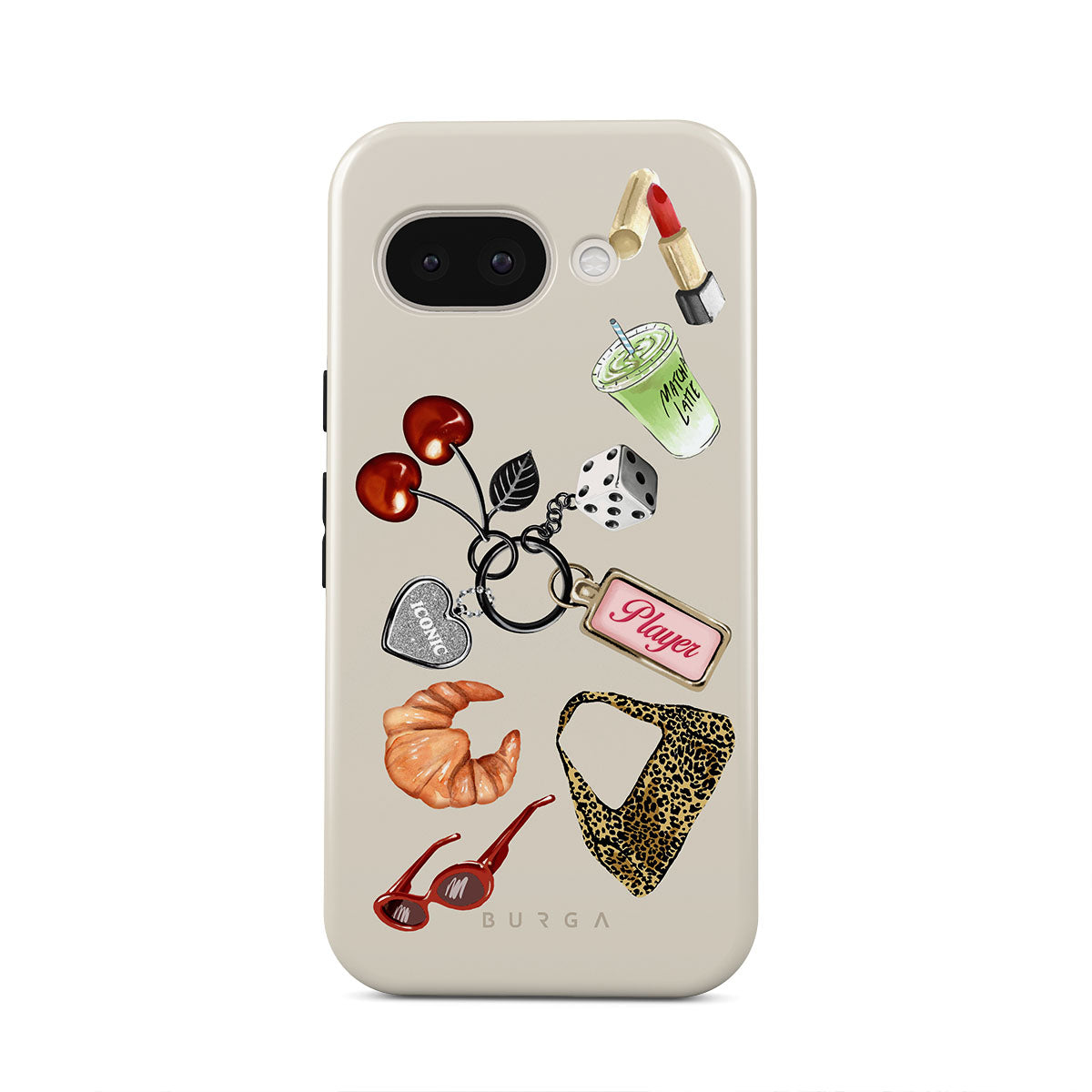 Dieses Design enthält: rote Sonnenbrille, roter Lippenstift, grünes Matcha-Getränk, Croissant, schwarze Würfel, Leopardenmuster-Tasche, Schlüsselanhänger mit silbernem Herz, Kirschen, Würfel und „Player“-Tag.
