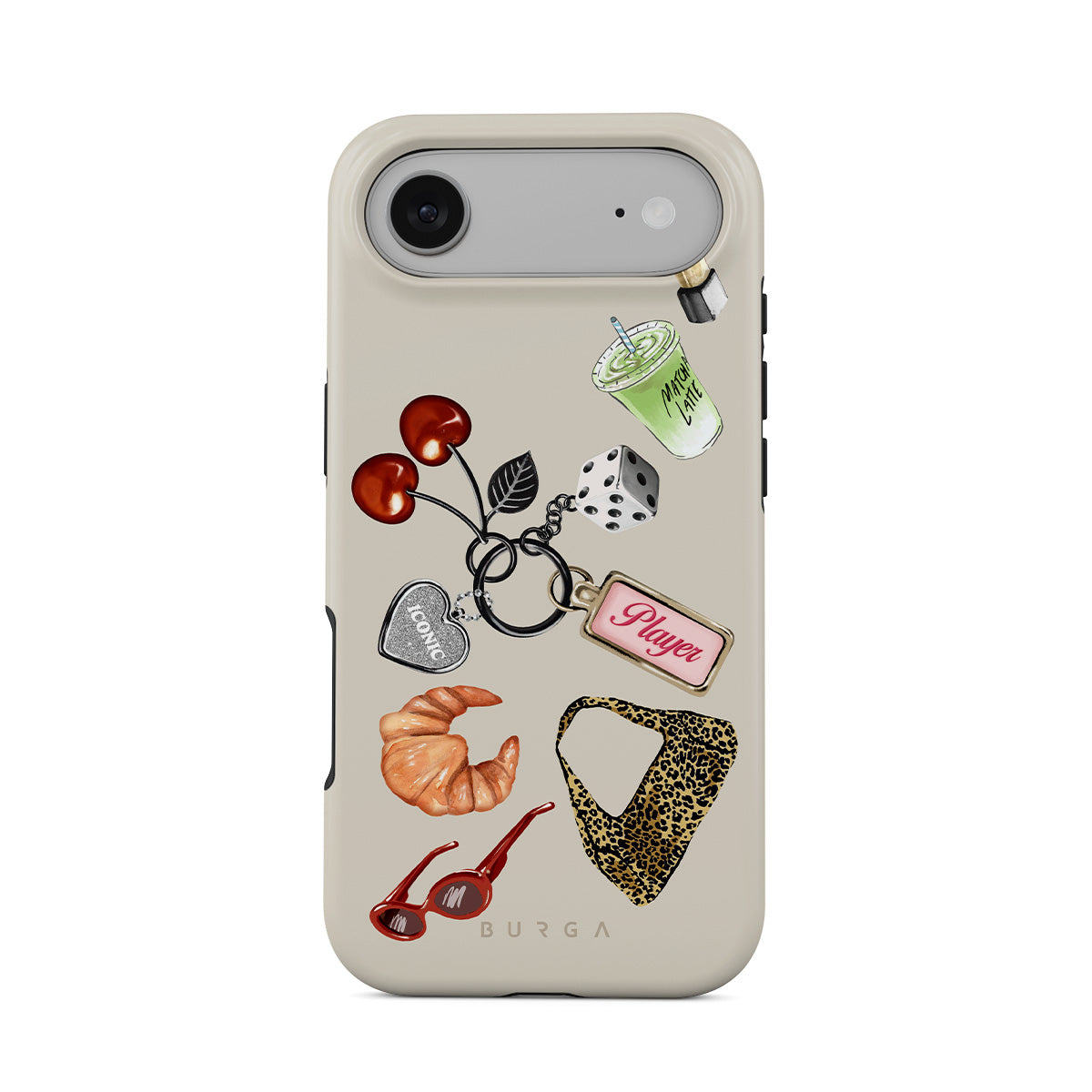 Dieses Design enthält: rote Sonnenbrille, roter Lippenstift, grünes Matcha-Getränk, Croissant, schwarze Würfel, Leopardenmuster-Tasche, Schlüsselanhänger mit silbernem Herz, Kirschen, Würfel und „Player“-Tag.