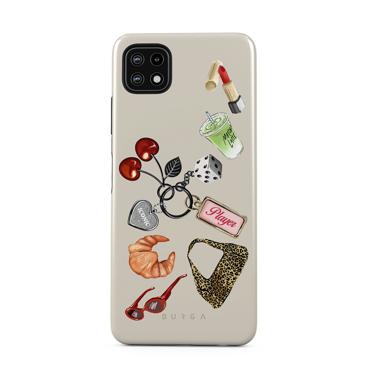 Dieses Design enthält: rote Sonnenbrille, roter Lippenstift, grünes Matcha-Getränk, Croissant, schwarze Würfel, Leopardenmuster-Tasche, Schlüsselanhänger mit silbernem Herz, Kirschen, Würfel und „Player“-Tag.