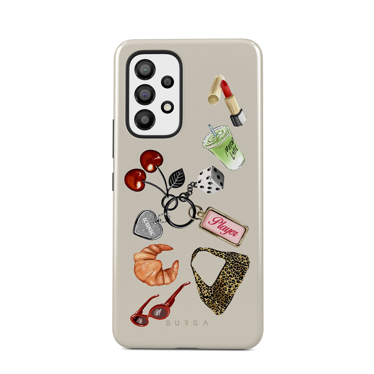 Dieses Design enthält: rote Sonnenbrille, roter Lippenstift, grünes Matcha-Getränk, Croissant, schwarze Würfel, Leopardenmuster-Tasche, Schlüsselanhänger mit silbernem Herz, Kirschen, Würfel und „Player“-Tag.
