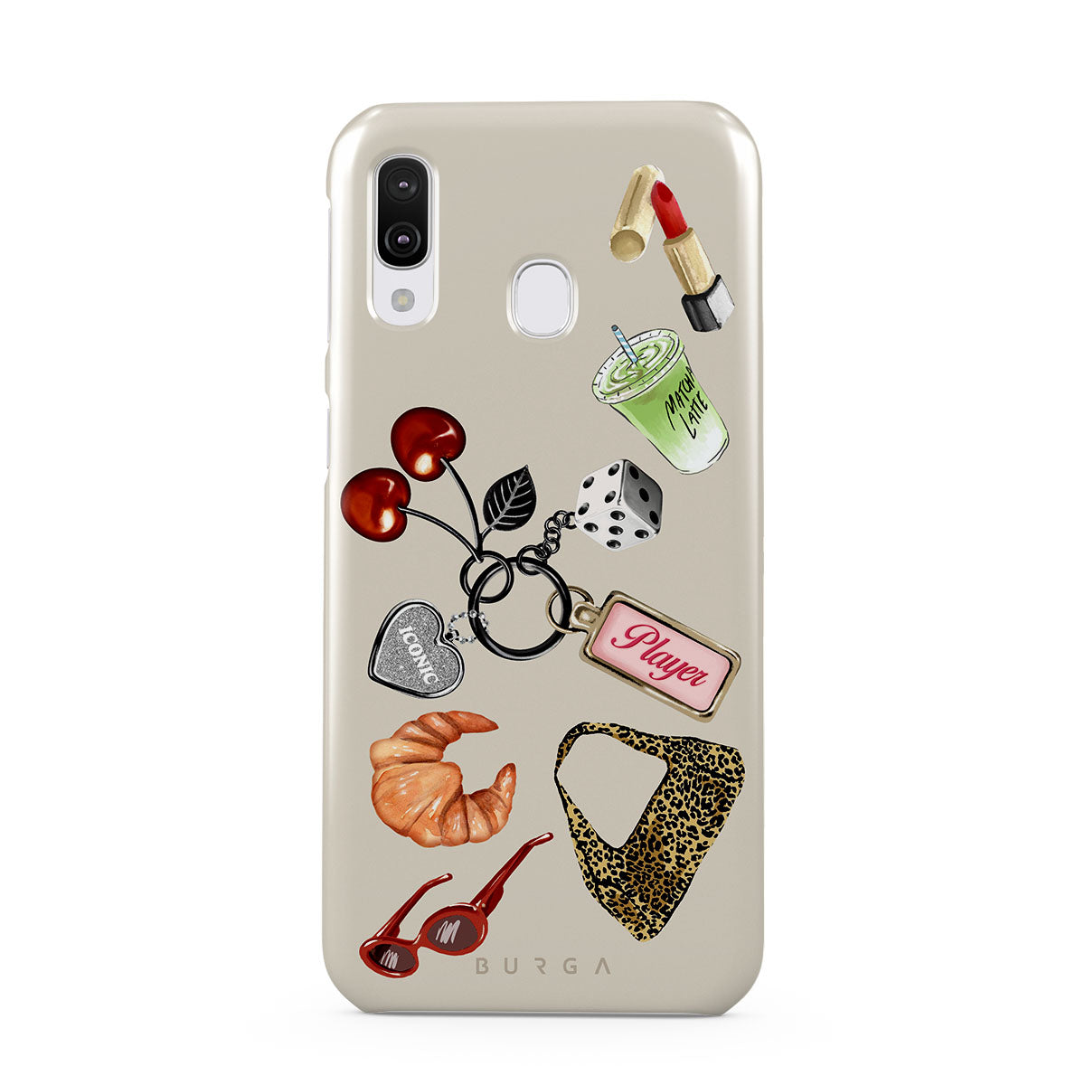 Dieses Design enthält: rote Sonnenbrille, roter Lippenstift, grünes Matcha-Getränk, Croissant, schwarze Würfel, Leopardenmuster-Tasche, Schlüsselanhänger mit silbernem Herz, Kirschen, Würfel und „Player“-Tag.