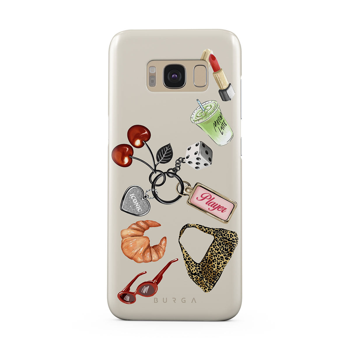 Dieses Design enthält: rote Sonnenbrille, roter Lippenstift, grünes Matcha-Getränk, Croissant, schwarze Würfel, Leopardenmuster-Tasche, Schlüsselanhänger mit silbernem Herz, Kirschen, Würfel und „Player“-Tag.