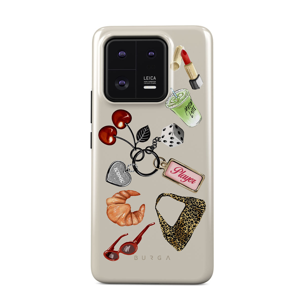 Dieses Design enthält: rote Sonnenbrille, roter Lippenstift, grünes Matcha-Getränk, Croissant, schwarze Würfel, Leopardenmuster-Tasche, Schlüsselanhänger mit silbernem Herz, Kirschen, Würfel und „Player“-Tag.