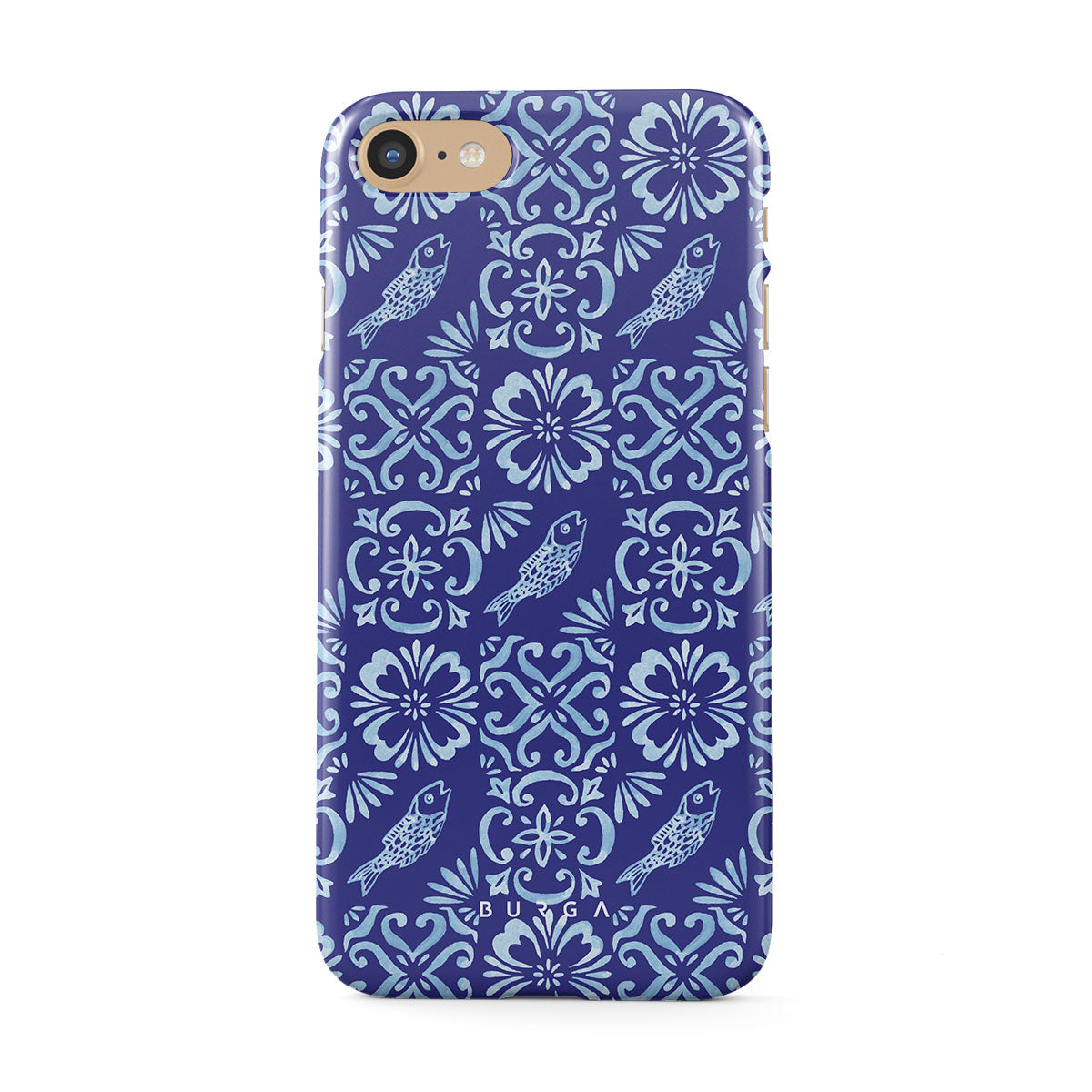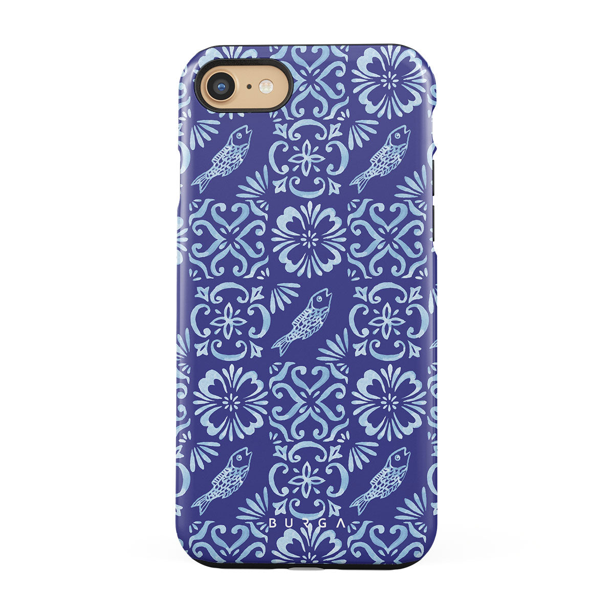 Dieses Design enthält: portugiesische Fliesenmuster, tiefe Blautöne, Blumenmuster, Blumen, Fische