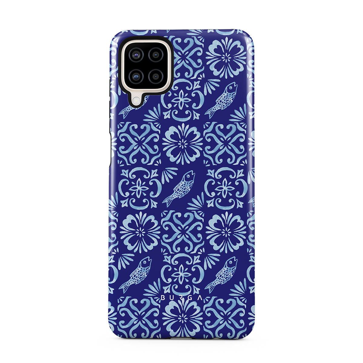 Dieses Design enthält: portugiesische Fliesenmuster, tiefe Blautöne, Blumenmuster, Blumen, Fische