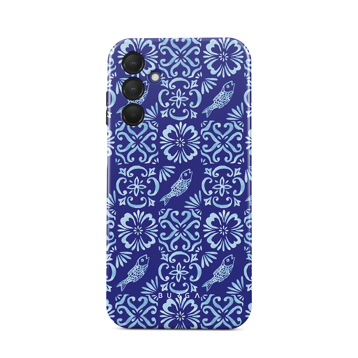 Dieses Design enthält: portugiesische Fliesenmuster, tiefe Blautöne, Blumenmuster, Blumen, Fische