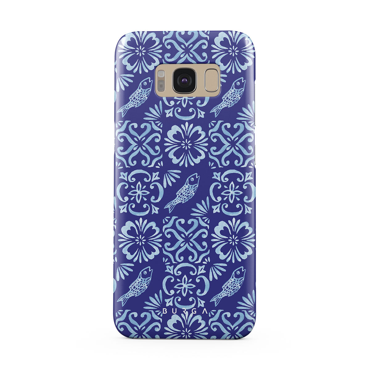Dieses Design enthält: portugiesische Fliesenmuster, tiefe Blautöne, Blumenmuster, Blumen, Fische
