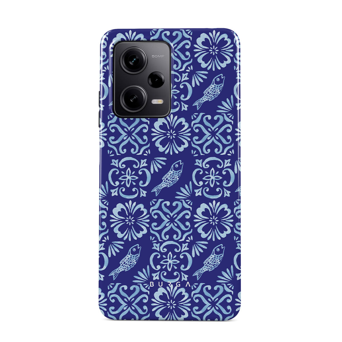 Dieses Design enthält: portugiesische Fliesenmuster, tiefe Blautöne, Blumenmuster, Blumen, Fische