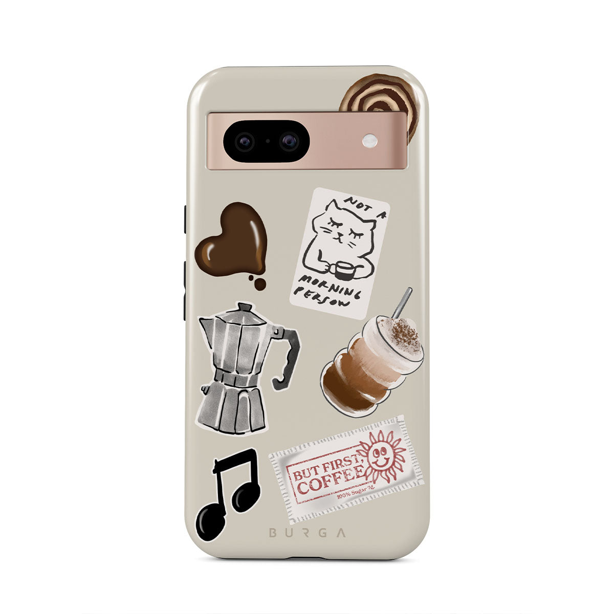 Dieses Design enthält: Mokkakanne, Frappe, Zimtschnecke, Schokoladenherz, „Not a morning person“-Sticker, „But First, Coffee“-Kassenbon, Musiknote.