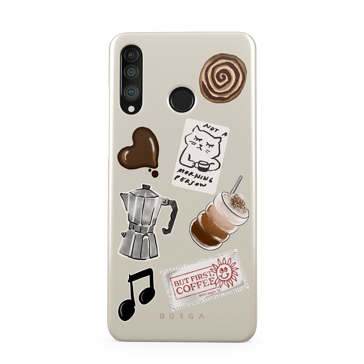 Dieses Design enthält: Mokkakanne, Frappe, Zimtschnecke, Schokoladenherz, „Not a morning person“-Sticker, „But First, Coffee“-Kassenbon, Musiknote.
