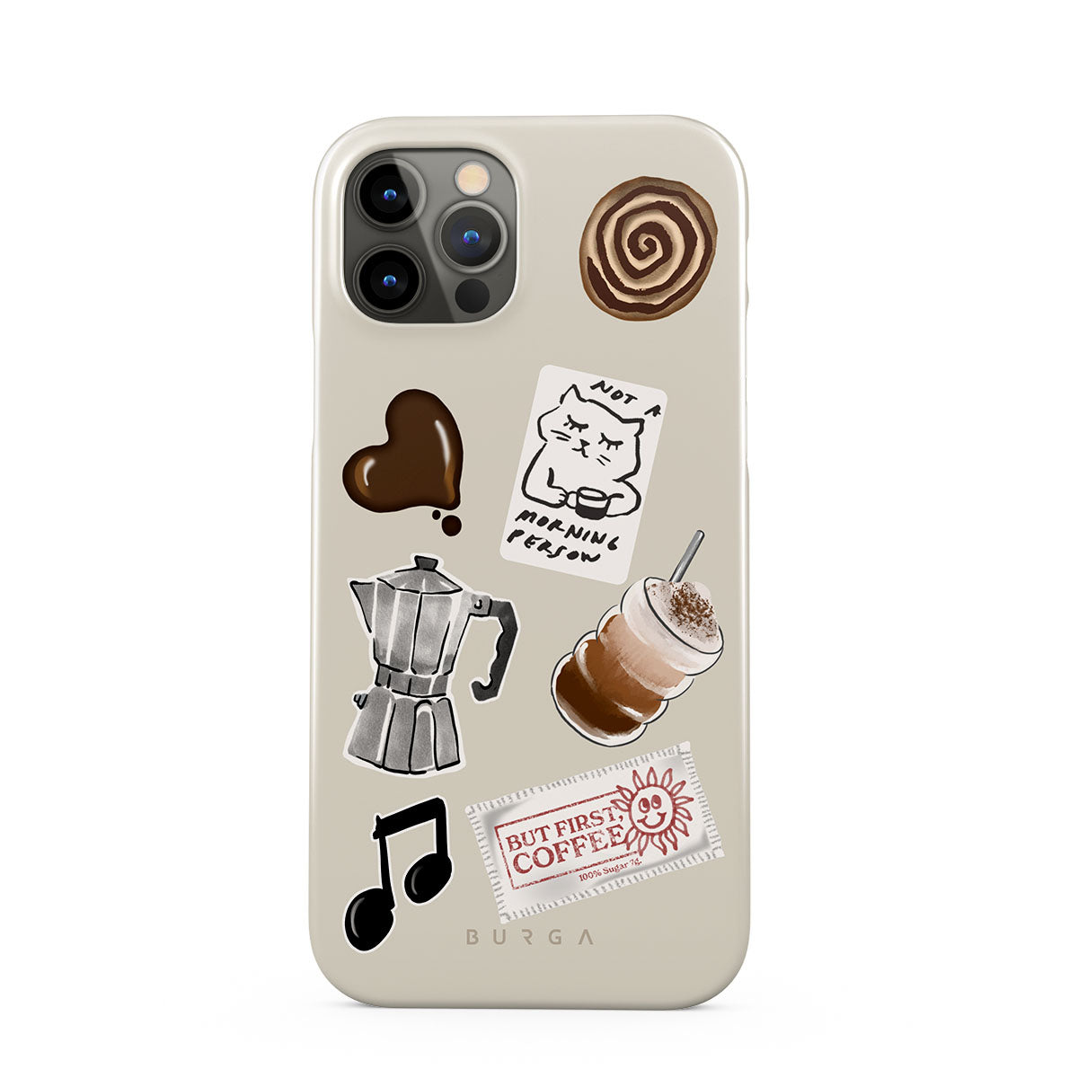 Dieses Design enthält: Mokkakanne, Frappe, Zimtschnecke, Schokoladenherz, „Not a morning person“-Sticker, „But First, Coffee“-Kassenbon, Musiknote.