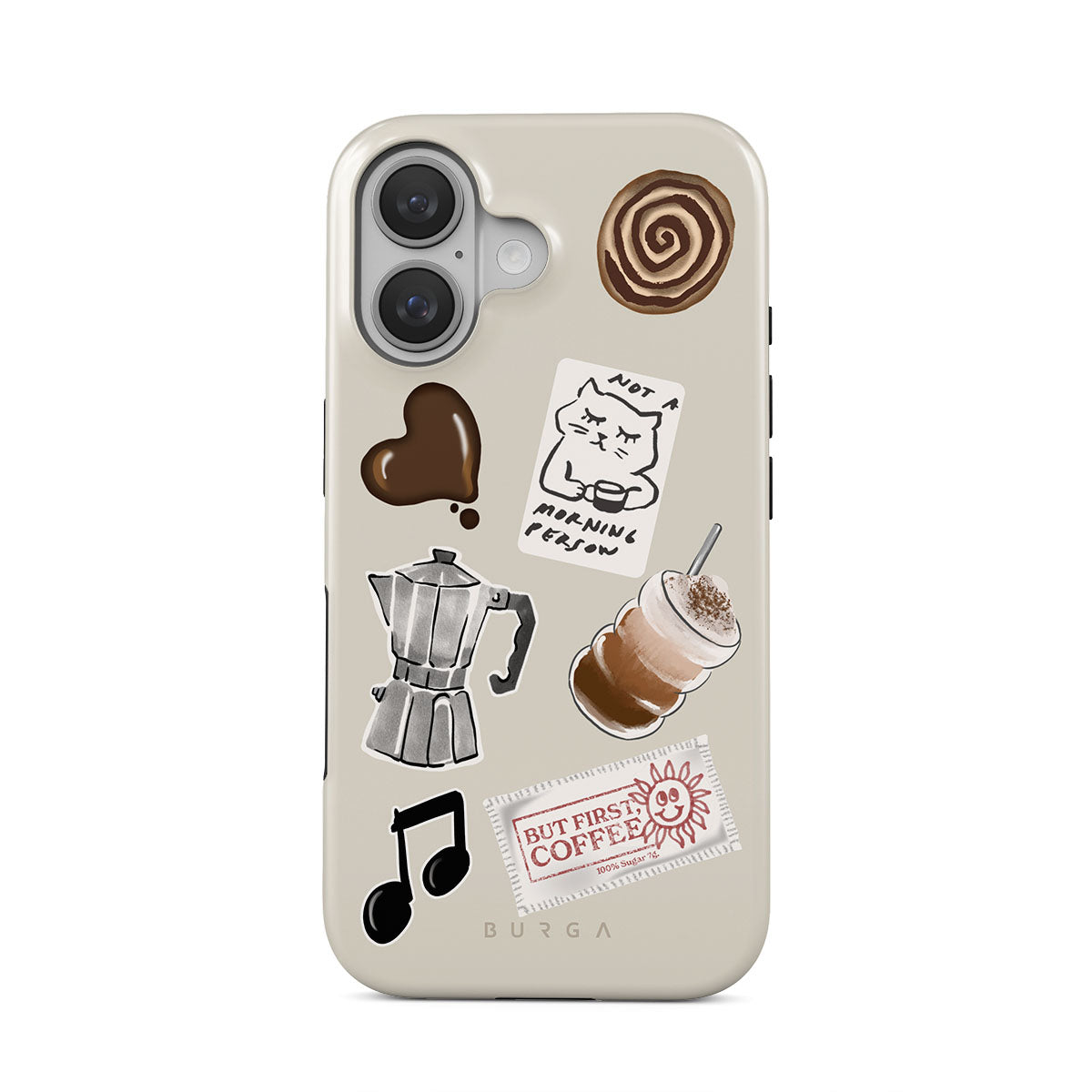 Dieses Design enthält: Mokkakanne, Frappe, Zimtschnecke, Schokoladenherz, „Not a morning person“-Sticker, „But First, Coffee“-Kassenbon, Musiknote.