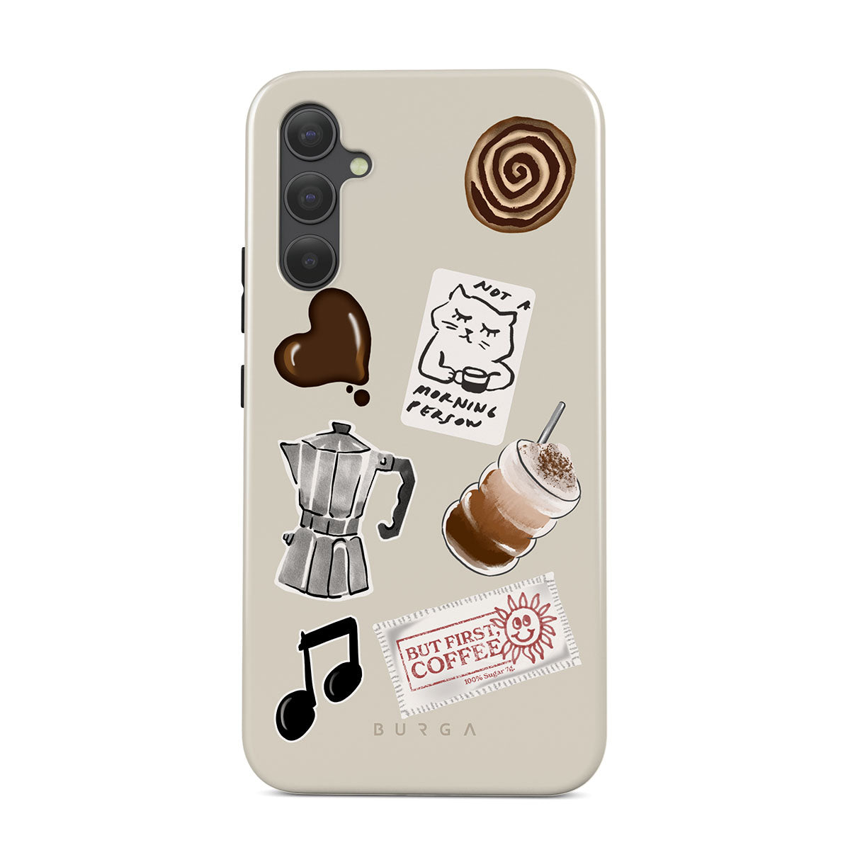 Dieses Design enthält: Mokkakanne, Frappe, Zimtschnecke, Schokoladenherz, „Not a morning person“-Sticker, „But First, Coffee“-Kassenbon, Musiknote.