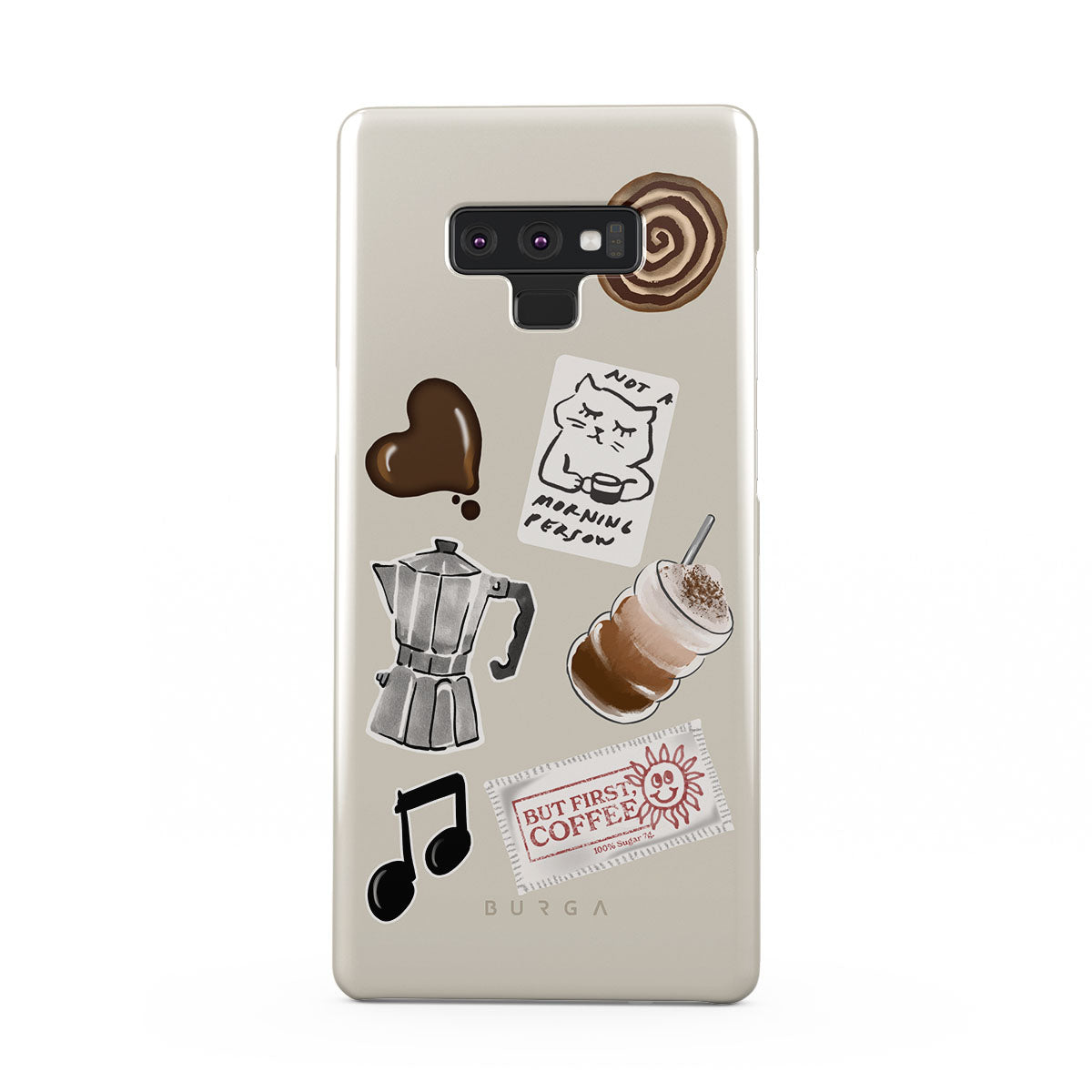 Dieses Design enthält: Mokkakanne, Frappe, Zimtschnecke, Schokoladenherz, „Not a morning person“-Sticker, „But First, Coffee“-Kassenbon, Musiknote.
