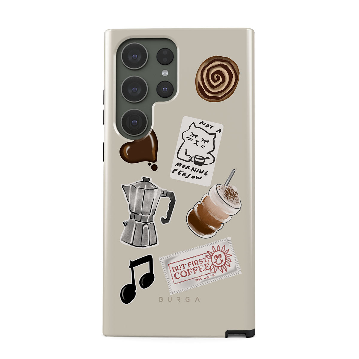 Dieses Design enthält: Mokkakanne, Frappe, Zimtschnecke, Schokoladenherz, „Not a morning person“-Sticker, „But First, Coffee“-Kassenbon, Musiknote.